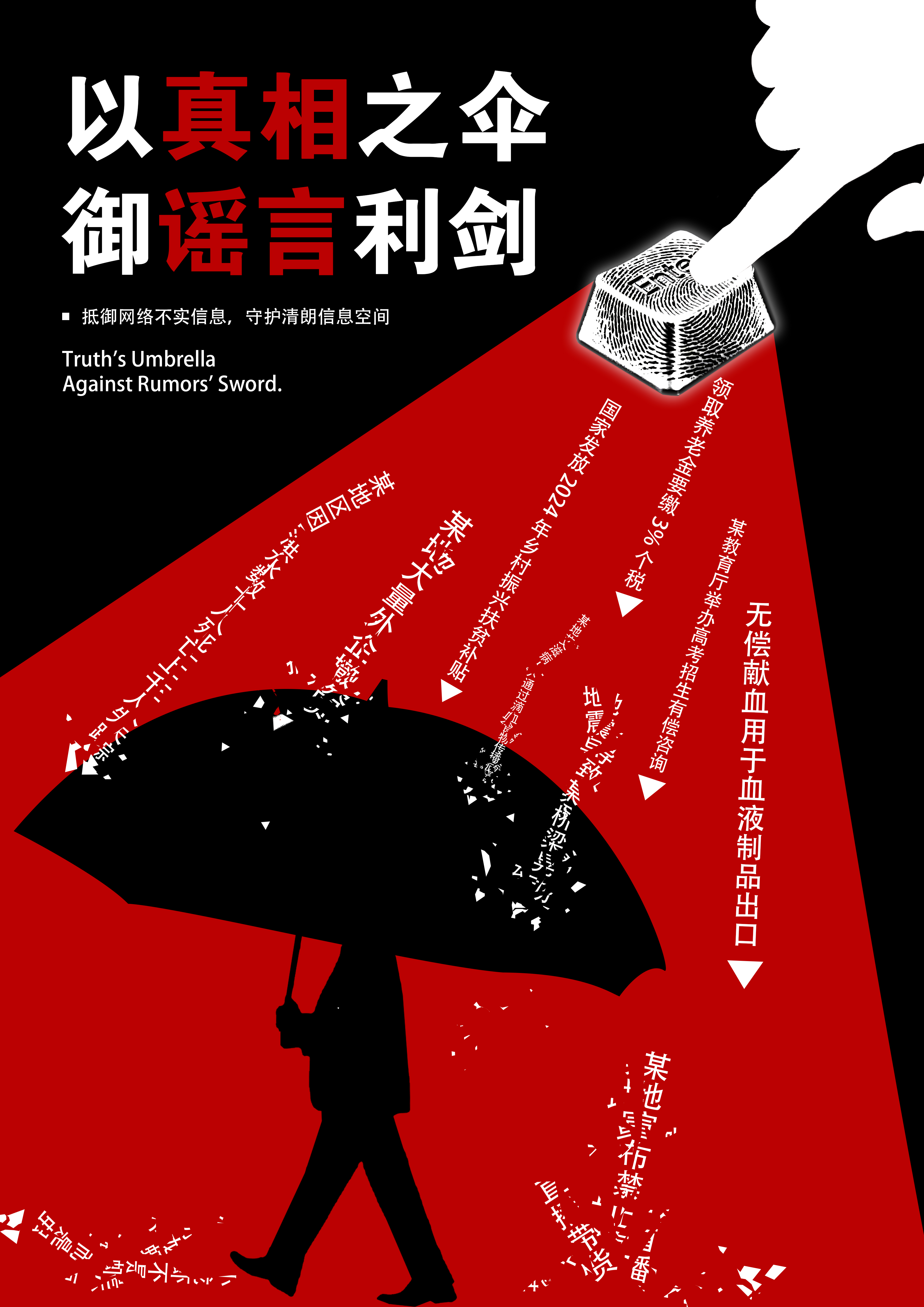 作品聚焦网络谣言治理,借 “真相之伞” 抵御 “谣言利剑” 主题,回应网络谣言泛滥的现实。以指纹化发送键、谣言利剑、真相伞的视觉符号,呼吁公众辨谣传真,凝聚护真力量,传递 “以真御谣” 理念,助力清朗网络生态构建 。