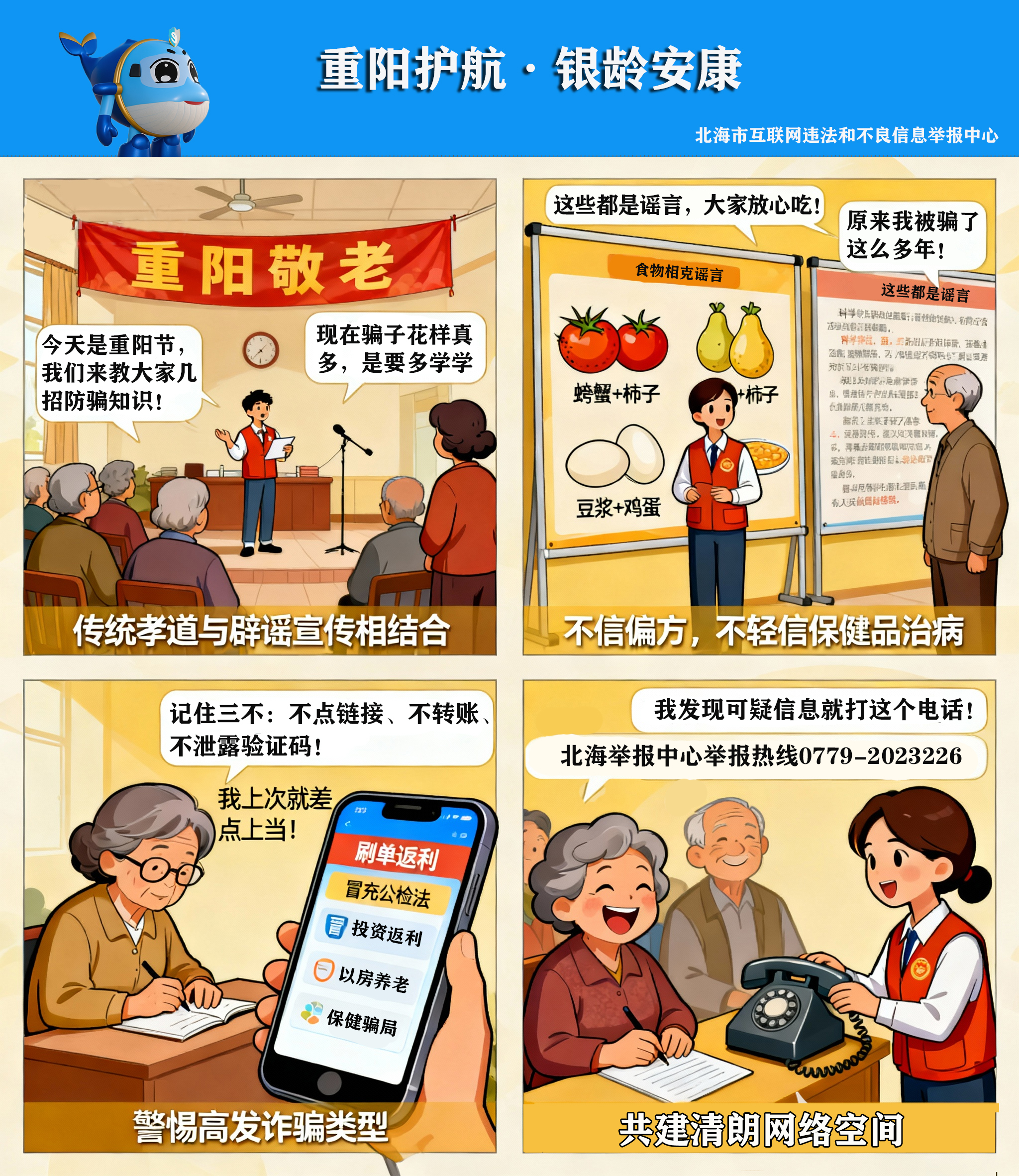 作品主题及创作背景:近年来,以老年人为欺诈对象的骗局屡见不鲜,可能给老年群体造成经济上的损失,严重侵害他们的身心健康与合法权益。在重阳节当天,制作四格漫画作品进行科普,提醒老年人及广大网民不信谣不传谣,发现谣言及时举报。