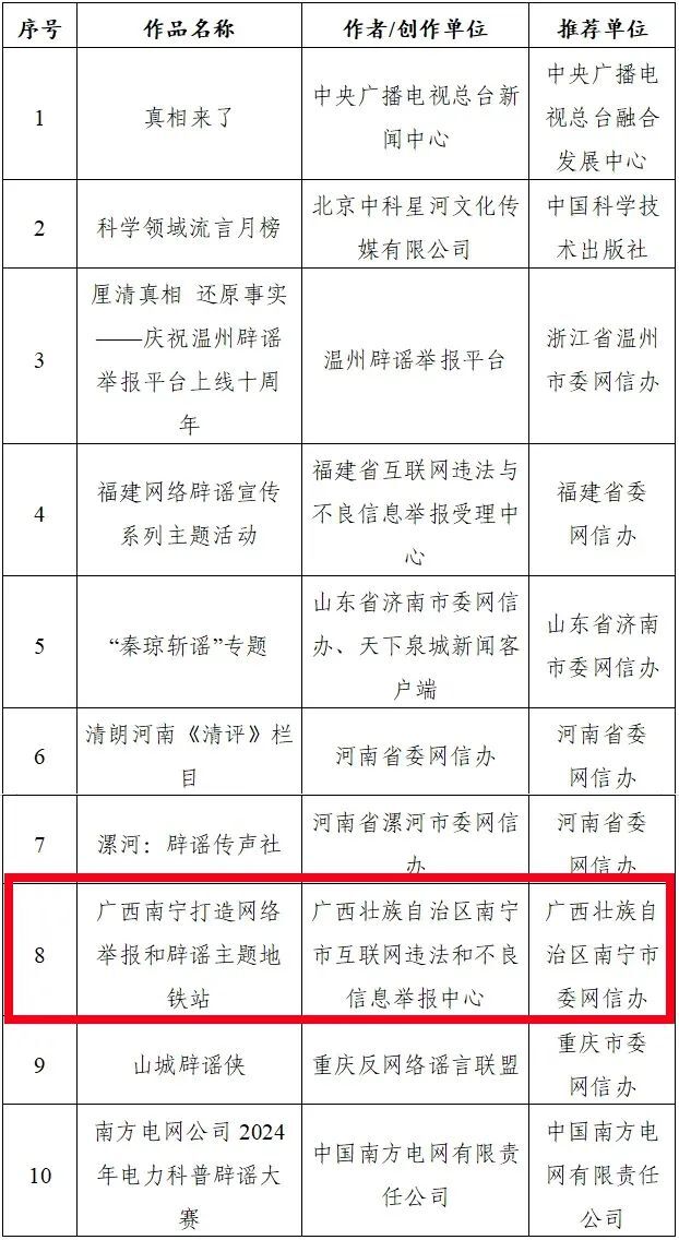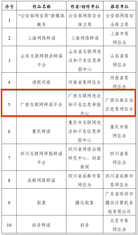 4月15日,第七届互联网辟谣优秀作品发布会于河南郑州举行,现场揭晓了本届互联网辟谣优秀作品。广西有两件作品获奖,分别是:《广西南宁打造网络举报和辟谣主题地铁站》获评“重大辟谣专题”类优秀作品,“广西互联网辟谣平台”获评“优秀辟谣平台(账号)”奖项。