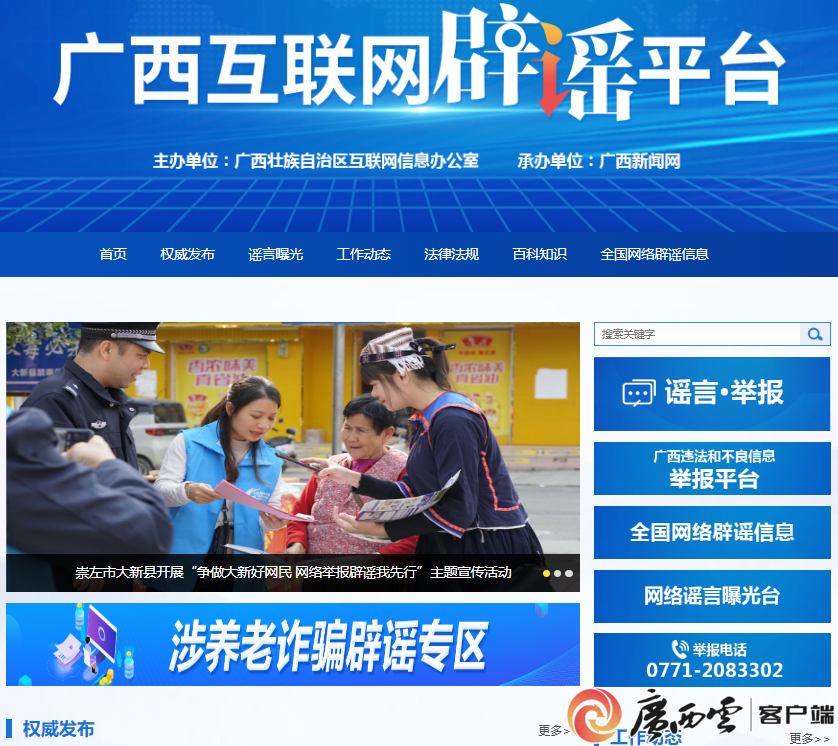 “广西互联网辟谣平台”由广西壮族自治区互联网信息办公室主办、广西互联网违法和不良信息举报中心指导、广西云-广西日报承办。平台于2020年10月31日上线后,累计发布辟谣信息超8万条,生产原创辟谣内容600余条,官方账号全面覆盖抖音、今日头条、小红书、微博、微信公众号等主流社交平台,总阅读量高达4000万人次。作为广西本土极具影响力的官方辟谣账号,该平台有力维护了网络空间秩序,切实提升了公众网络识谣、辨谣能力,成为广西治理网络谣言、迅速澄清网络谣言的权威阵地。