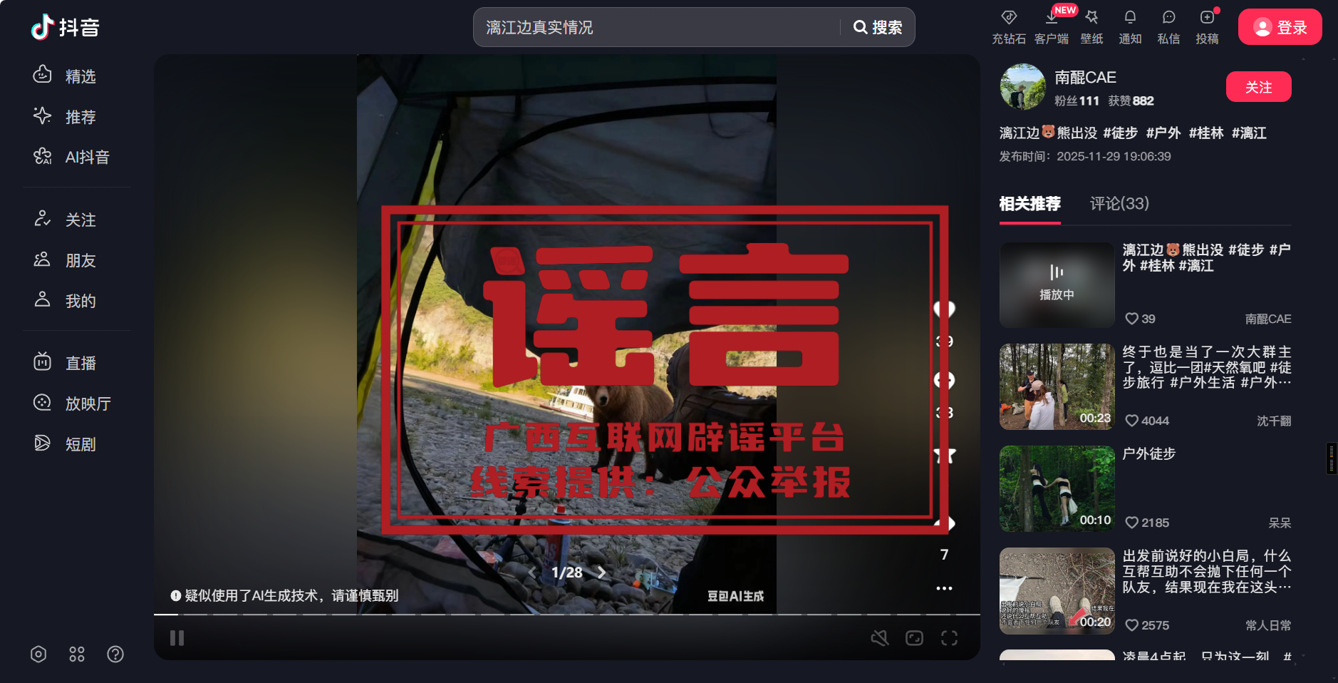 2025年12月8日,桂林市公安局七星分局在网络巡查工作中发现,网民曾某于11月29日晚,通过AI软件生成一段“大黑熊出现在漓江边”的虚假视频,并将该视频发布至抖音平台。