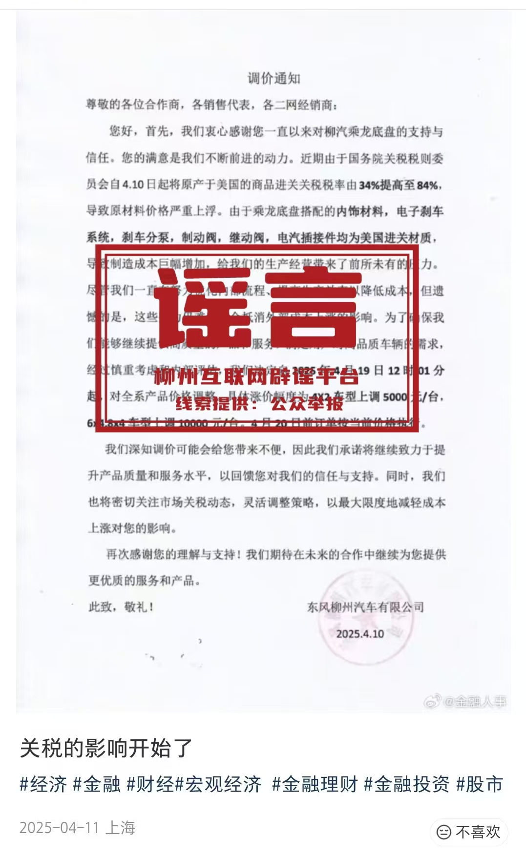 真相:经核实,网传信息不实。东风柳州汽车有限公司从未发布任何关于“因关税调整导致产品价格上调”的通知。东风柳州汽车有限公司产品价格政策稳定透明。所有官方信息均通过公司官网、官方微信公众号及授权渠道发布。