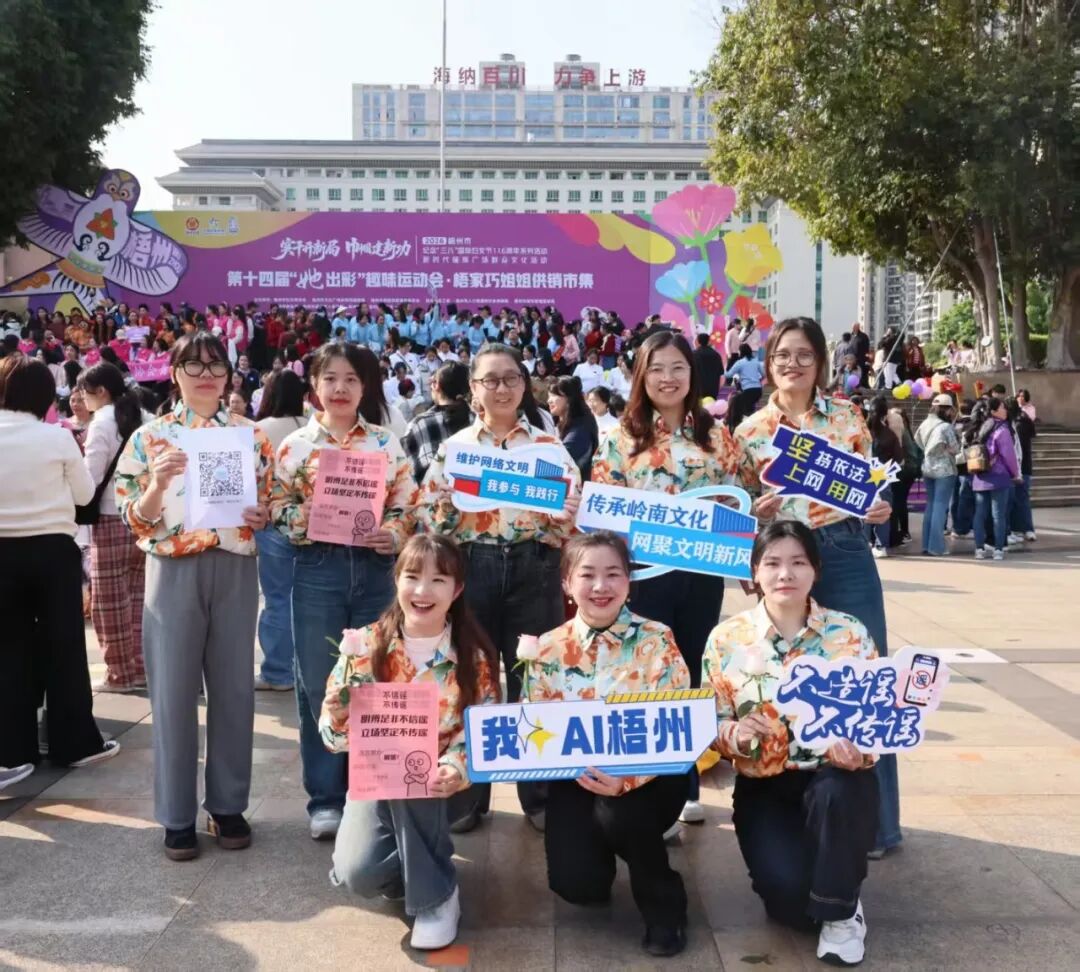 活动现场,工作人员身着统一服装,精神饱满地参与其中。大家手持“维护网络文明 我参与我践行”“传承岭南文化 网聚文明新风”“我AI梧州”等宣传手牌,在充满活力的活动氛围中,共同发出网络文明倡议,展现了网信队伍在网络综合治理工作中的责任与担当。