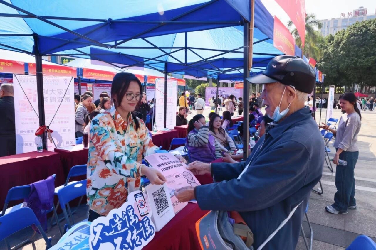 工作人员主动向过往群众递上宣传手册等资料,结合“AI 伪造官员讲话视频”、“微信好友过多会被封号”等谣言案例,用通俗易懂的语言讲解网络谣言的识别方法、传播危害及法律责任,手把手指导大家通过12377举报平台、“梧州网信执法”公众号等官方渠道核实信息、举报不良内容,引导市民自觉抵制网络谣言,积极参与网络文明建设。