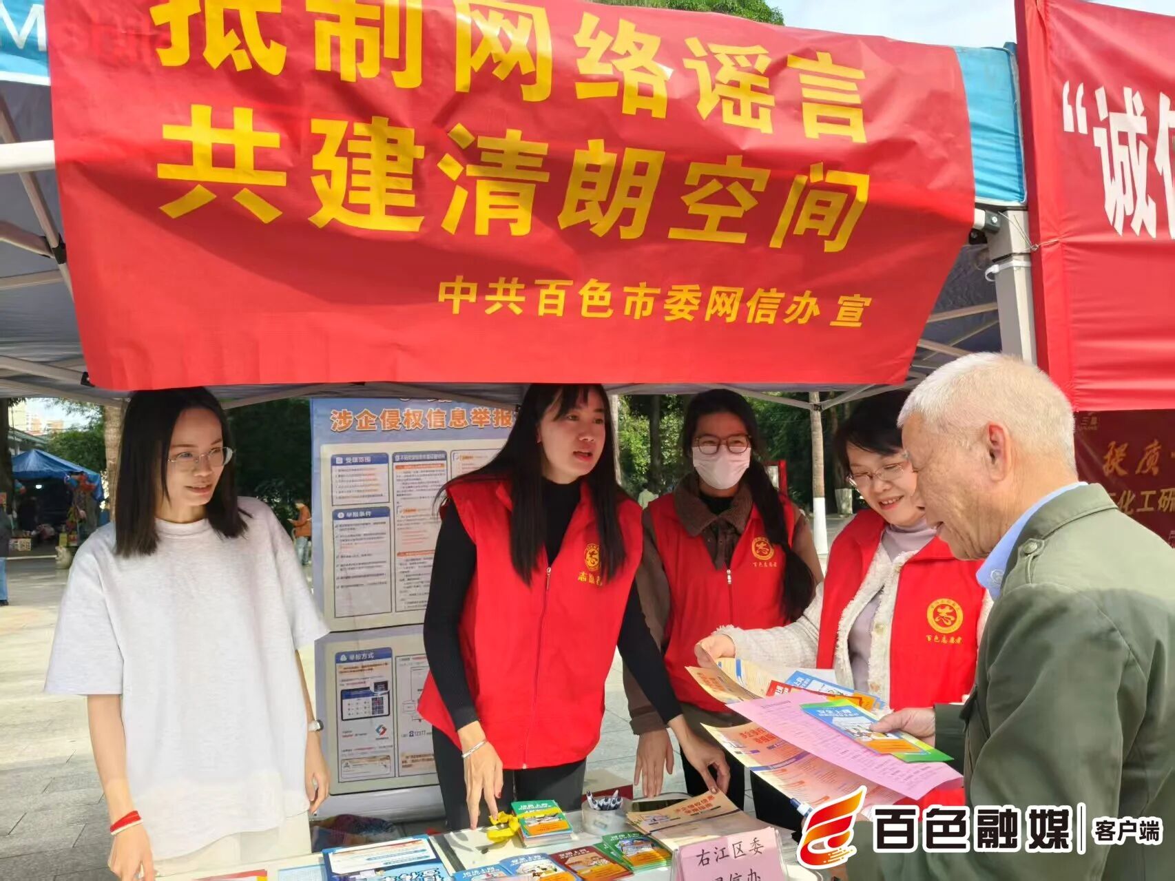 3月13日,百色市委网信办联合市市场监督管理局,在百色森林广场开展“抵制网络谣言 共建清朗空间”主题宣传活动,将消费者权益保护与网络生态治理相结合,向市民普及网络谣言辨别方法和举报渠道。