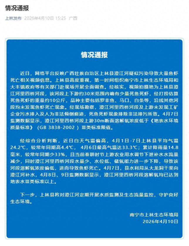 经综合分析判断,近日白天气温偏高,4月1日—7日上林县平均气温24.2℃,较常年同期高4.4℃,4月6日最高气温达33.3℃;累计降雨量14.8毫米,较常年同期少33%,且当前春耕时节上游农业用水调节下泄补水水流量减少,同时澄江河里四桥河段水量少、水位低、储氧能力进一步下降,导致该河段溶解氧浓度偏低,进而导致鱼虾死亡。