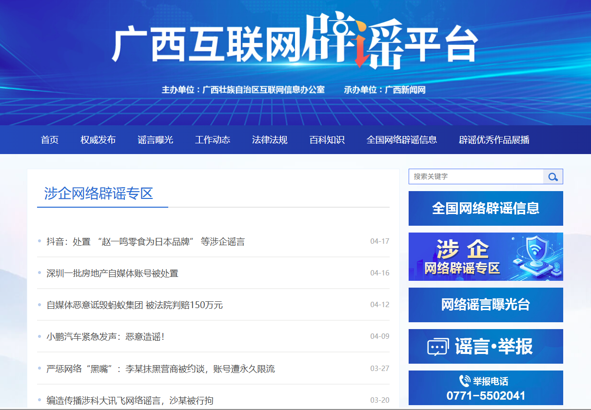 4月23日,广西互联网辟谣平台“涉企网络辟谣专区”正式上线。专区集中发布广西本地及全国范围内的涉企权威辟谣信息,对误导社会公众、扰乱市场秩序、侵害企业合法权益的网络谣言,及时开展权威辟谣,还原事实真相,遏制谣言传播。同时,帮助企业学习借鉴成熟舆情处置经验,做到快速甄别研判、主动发声、精准处置,守护企业品牌信誉。