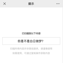 在此次大量转发的二维码中,存在两种情况。第一种为恶作剧性质,扫描后显示“你是不是白日做梦?”。此类二维码正可谓“伤害性不高,但侮辱性极强”。