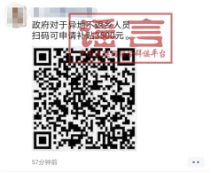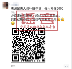 近日,网友反映朋友圈中有人转发二维码,称“扫码即可领取异地过年政府补贴,3500—5000元不等,1月31日截止。”