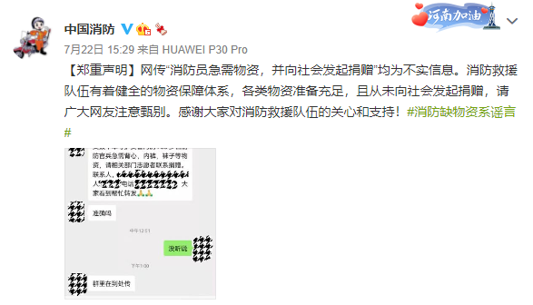 7月22日,@中国消防 发布辟谣消息:网传“消防员急需物资,并向社会发起捐赠”均为不实信息。消防救援队伍有着健全的物资保障体系,各类物资准备充足,且从未向社会发起捐赠,请广大网友注意甄别。