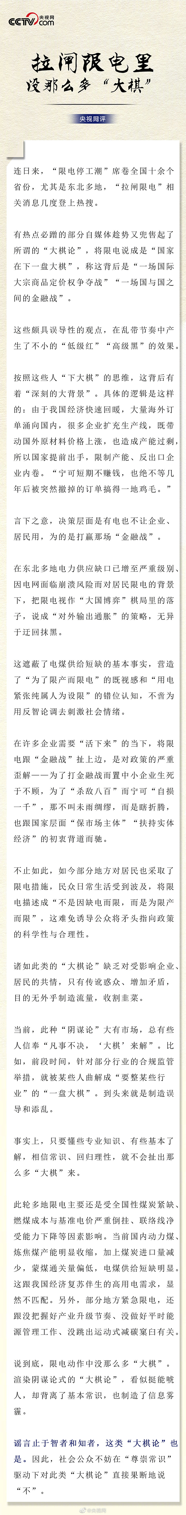 在最近“限电停工潮”中,所谓“大棋论”遮蔽了电煤供给短缺的基本事实,营造了“为了限产而限电”的既视感和“用电紧张纯属人为设限”的错位认知,不啻为用反智论调去刺激社会情绪。在乱带节奏中产生了不小的“低级红”“高级黑”的效果。对此,我们应在“尊崇常识”驱动下对此类“大棋论”直接果断地说“不”。