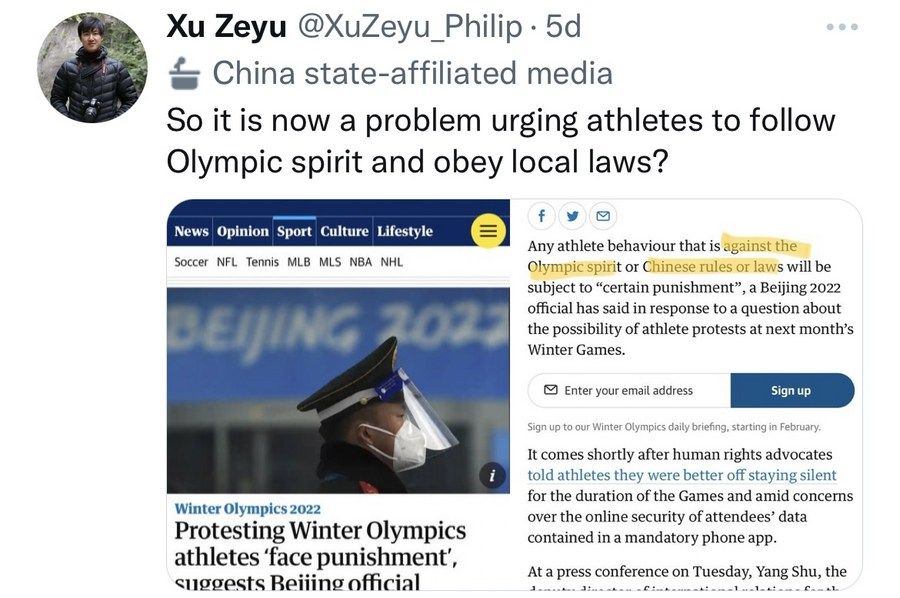 为此,新华社记者徐泽宇在推特上质问这篇报道:“难道提醒运动员坚持奥林匹克精神和遵守当地法律法规也有错吗?”