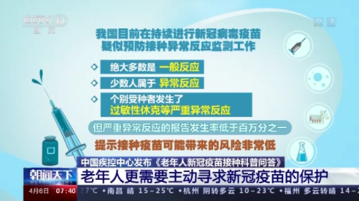 老年人是否有必要接种加强针?中国疾控中心专家表示,老年人接种加强免疫针后,对于新冠病毒感染后导致重症和死亡的风险可降低90%以上。