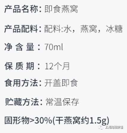 而在有些即食燕窝的配料表中,出现了银耳、红枣、枸杞等大量无关的食材,燕窝却排在后面。按照国家标准,配料表内的原料要按照占比高低依次排列。