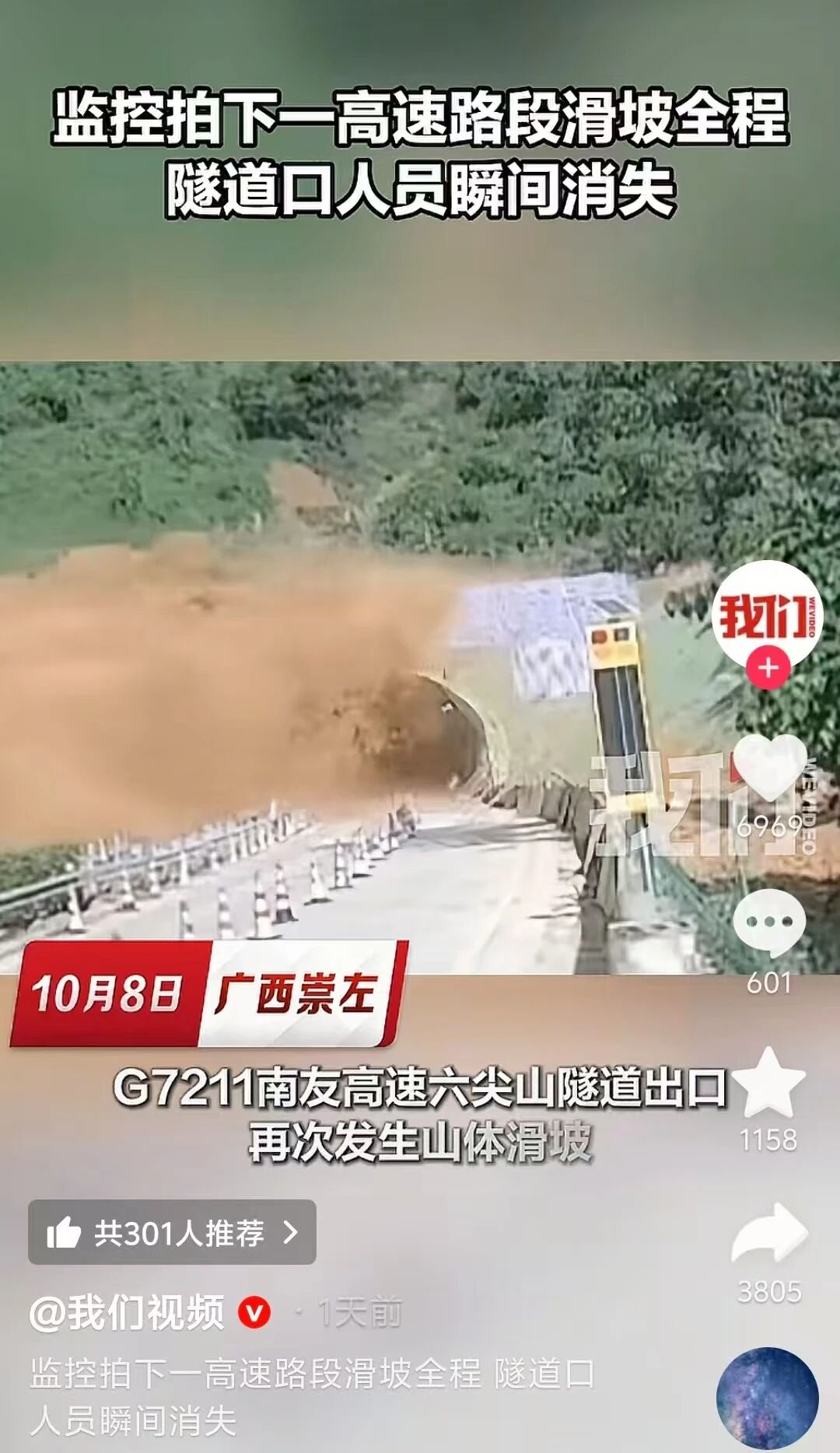 10月9日,有媒体报道10月8日南友高速六尖山隧道发生滑坡时的事故现场监控视频,监控显示“G7211南友高速六尖山隧道出口再次发生山体滑坡,隧道口人员瞬间消失”,引发网民关注。