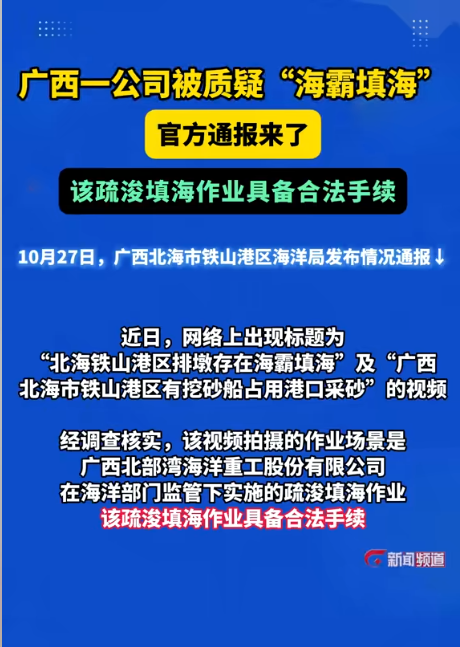 近日,网络上出现标题为“北海铁山港区排墩存在海霸填海”及“广西北海市铁山港区有挖砂船占用港口采砂”的视频,引发网民关注。