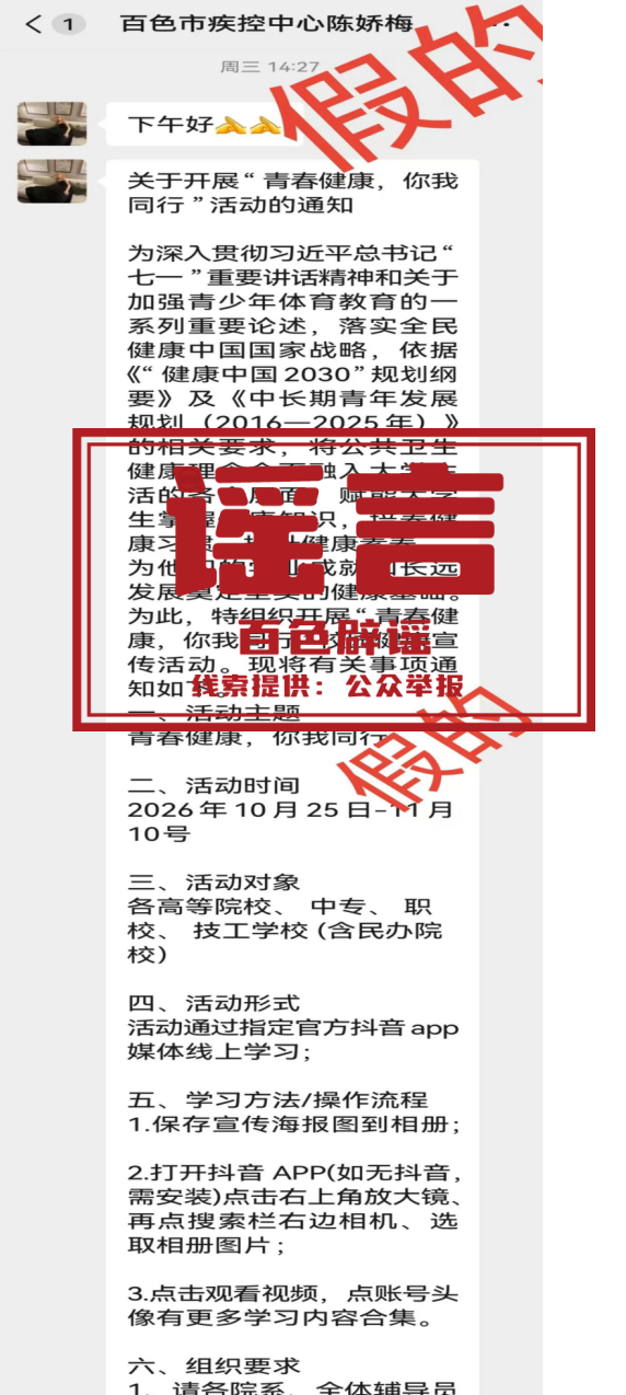 近日,百色市疾病预防控制中心接到多所学校及家长反馈,有自称“百色市疾控中心陈娇梅”的人员通过微信等渠道,以工作对接为名,要求添加好友,并散布关于开展“青春健康,你我同行”活动的不实通知,试图进入校园开展活动。对此,市疾控中心发布辟谣声明。