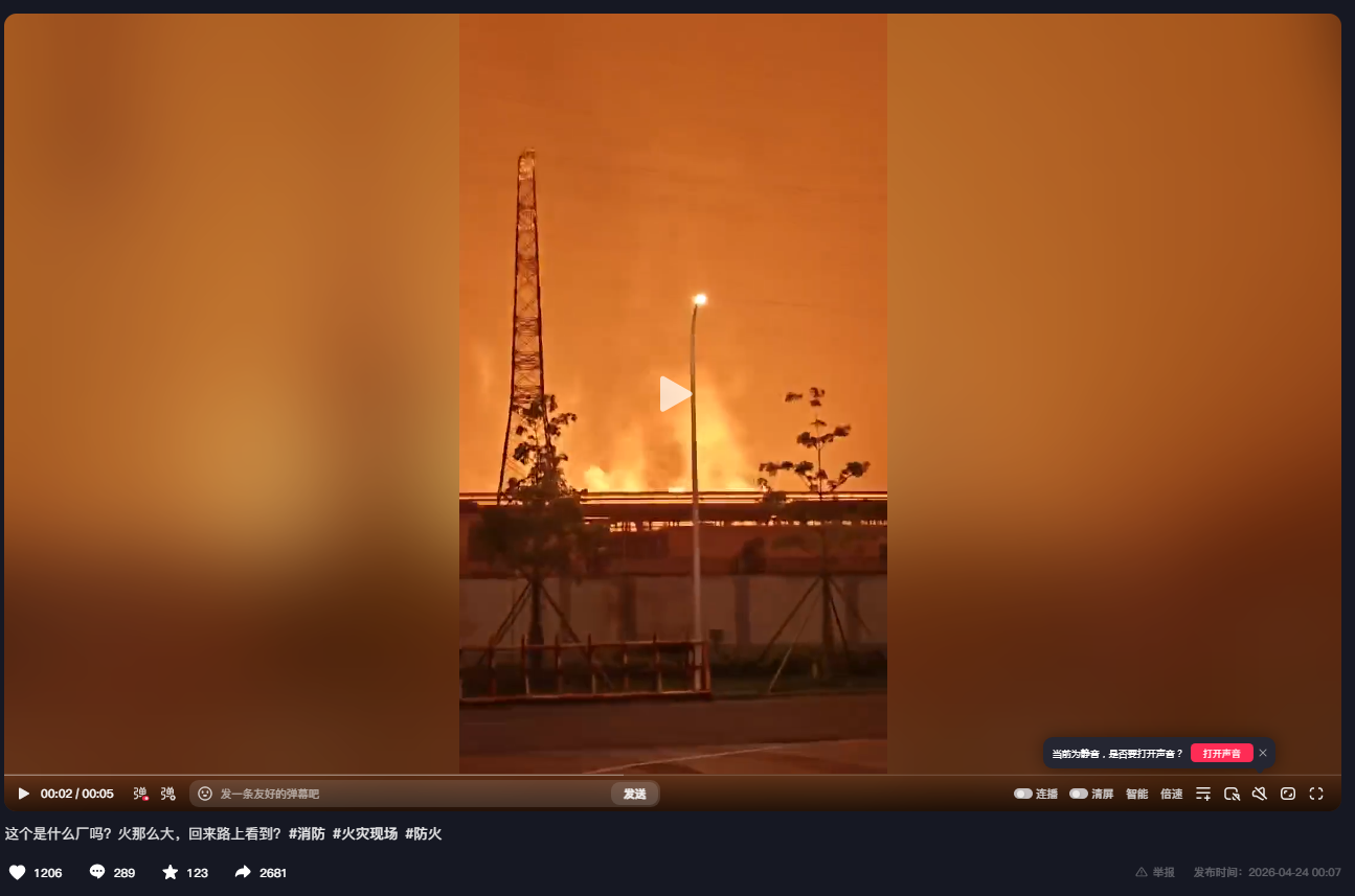 4月23日晚,公开平台多条信息显示,疑似钦州港一工厂突发火情,画面显示现场有明火燃烧,引发网民关注,是否发生火灾事故。