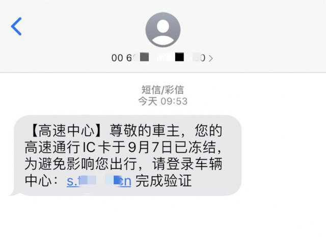 第一步:发送诈骗短信。骗子广撒网,向车主发送包含“已停用”、“已失效”、“已逾时”、“已过时”、“已冻结”、“未认证”等内容的诈骗短信。在这条短信中,会提示用户点击一个链接办理认证或验证。