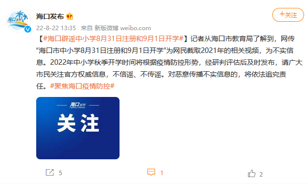 记者从海口市教育局了解到,网传“海口市中小学8月31日注册和9月1日开学”为网民截取2021年的相关视频,为不实信息。2022年中小学秋季开学时间将根据疫情防控形势,经研判评估后及时发布,请广大市民关注官方权威信息,不信谣、不传谣。对恶意传播不实信息的,将依法追究责任。