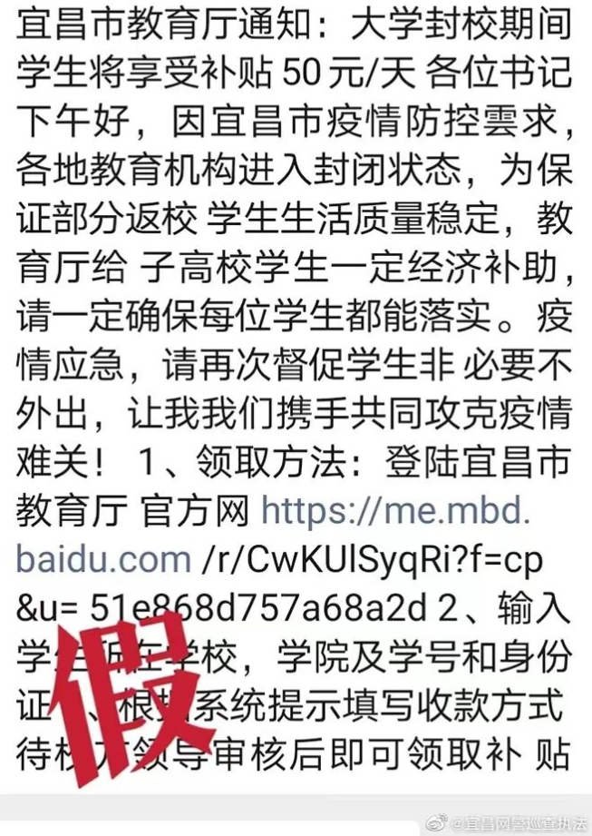 据湖北省宜昌市公安局网安支队官方微博@宜昌网警巡查执法消息,近日,一则“大学封校期间学生享受补贴50元/天”的帖子在微信群热传。