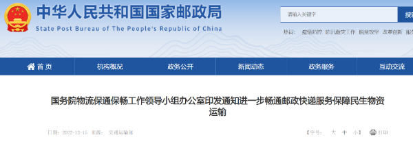 12月15日,国务院物流保通保畅工作领导小组办公室印发《关于进一步畅通邮政快递服务保障民生物资运输的通知》明确指出,各地物流保通保畅工作机制要全力打通邮政快递堵点卡点;要加强对当地邮政管理部门与相关部门的指导,统筹动员各方资源,细化入微各项举措,科学精准做好邮政快递保通保畅工作,保障邮件快件揽收投递顺畅,切实畅通邮政快递末端“微循环”。