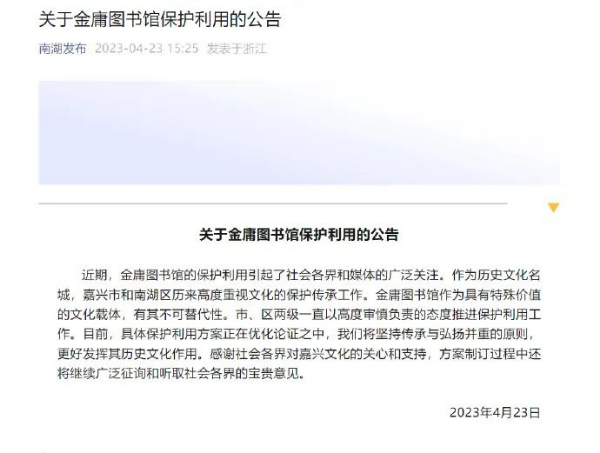 针对嘉兴学院金庸图书馆将被拆除的网友质疑,23日下午嘉兴“南湖发布”表示,嘉兴历来高度重视文化保护传承工作,金庸图书馆作为具有特殊价值的文化载体,有其不可替代性。目前具体保护利用方案正在优化论证之中,方案制订过程中还将继续征询和听取社会各界宝贵意见。