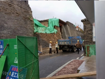 现场施工人员介绍,城墙上缺失的砖块是由于风化、白蚁侵蚀等原因导致墙砖老化,“我们正在修缮,是人工扒的,不是墙塌了。”