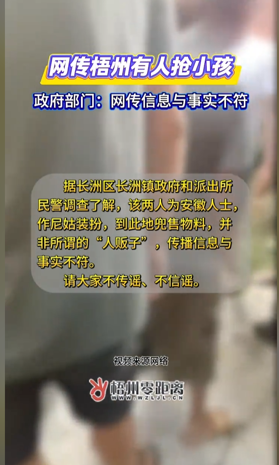经核实,网传视频内容不实。据长洲区长洲镇政府和派出所民警调查了解,该两人为安徽人士作尼姑装扮,到此地兜售物料,并非所谓的“人贩子”,传播信息与事实不符。