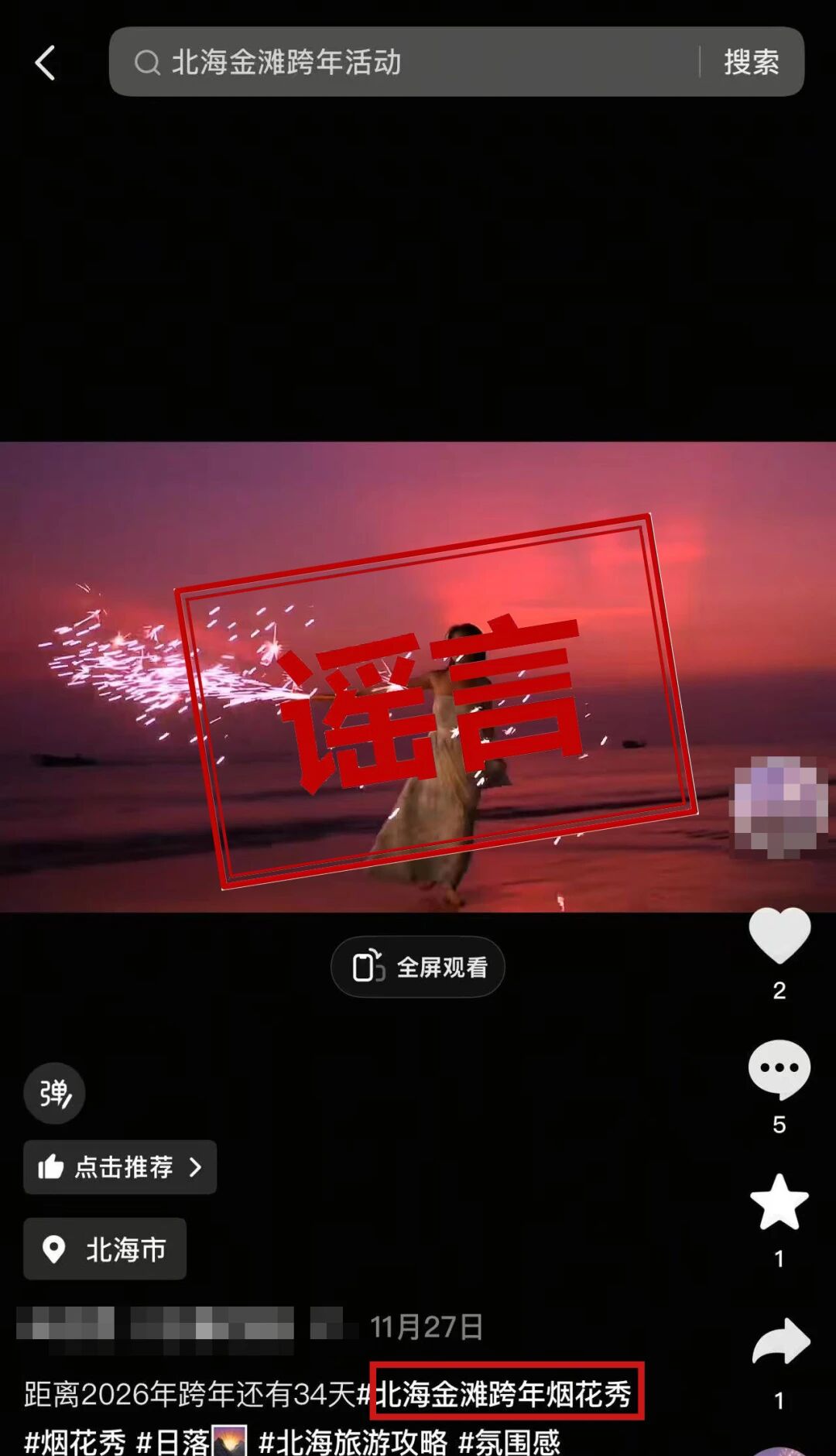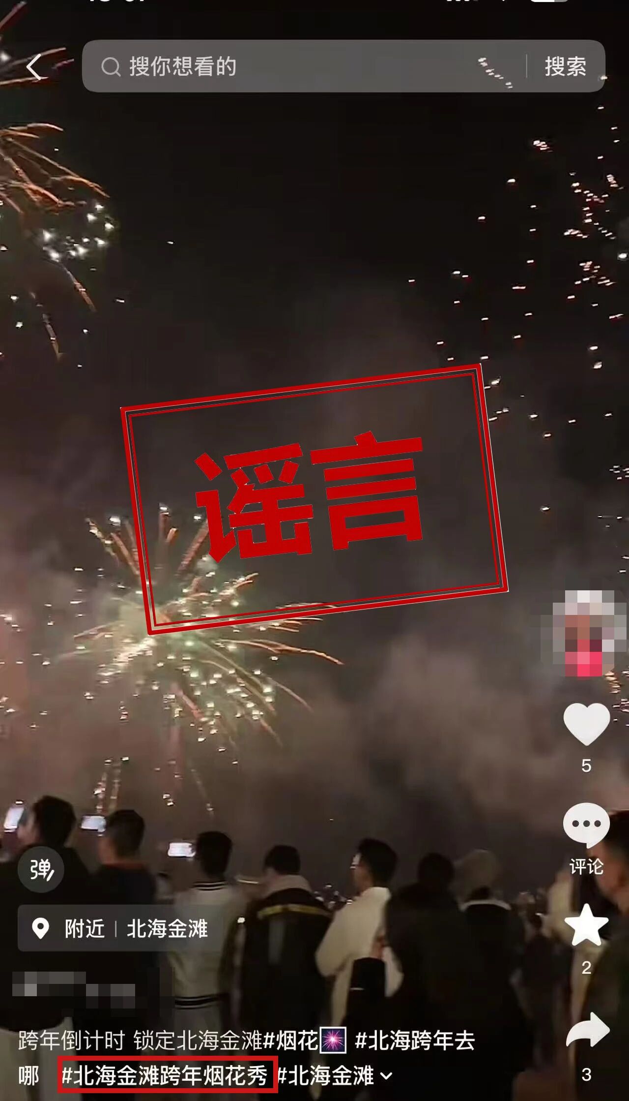 网民陆某为博取关注,在抖音平台发布一段女子在海滩燃放烟花的视频,并添加了“北海金滩跨年烟花秀”“烟花秀”等误导性话题,引发部分网民对“金滩烟花秀”话题的关注与讨论。